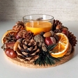 У процесі роботи ми використаємо натуральні матеріали: соковиті апельсини, ароматні горіхи, деревину та гілочки, ніжний декор і бусини, а також осінні символи – шишки. Усе це гармонійно поєднається у витвір, який не лише прикрасить ваш простір, а й стане символом домашнього затишку.